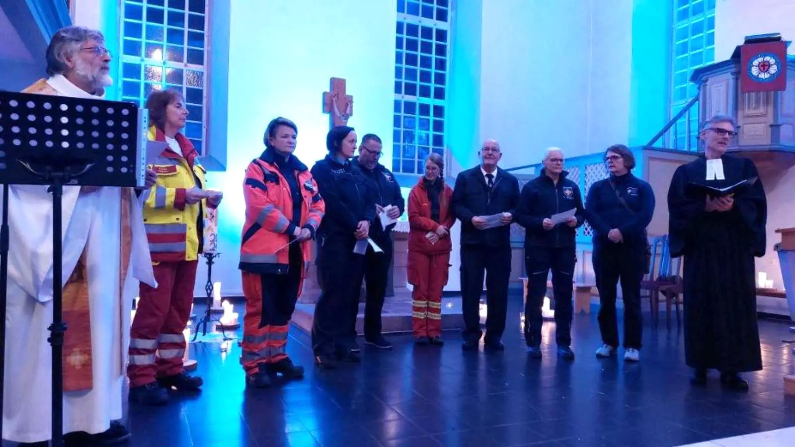 Geleitet wurde der Gottesdienst von dem evangelischen Pfarrer Jörg Fröhlich, Nachbarschaftsraum Mittlere Wetterau, und vom katholischen Pfarrer Bernd Richard aus Ilbenstadt. Sowohl die Predigt als auch die Lieder thematisierten das Licht, das jede:r aus der Blaulichtfamilie in die dunkelsten Situationen und Stunden zu Betroffenen bringen kann. Dazu passte neben dem Lied „Du bist das Licht der Welt“ auch das fetzige „My Lighthouse“, begleitet von einer spontan entstandenen Band. Besonders emotional wurde es, als Bestatterin Bettina Skottke, Wölfersheim, zusammen mit Stefan Bodem den Song „Schön, dass es dich gibt“ von Martin Pepper darbot.